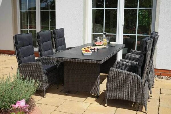 Für einen gemütlichen Nachmittag in der Sonne oder im Wintergarten können Sie es sich z. B. mit einem spannenden Buch oder einem leckeren Kaffee in einem der bequemen Dining-Sessel Platz gemütlich machen – dafür brauchen Sie einfach nur Platz zunehmen und sich Ihren Lieblingssessel, Dank stufenlos verstellbaren Rückenlehnen, problemlos in eine bequeme Sitzposition einstellen. Schmücken Sie Ihren liebevoll angelegten Garten mit einer edlen Esstischgarnitur aus Polyrattan. Genießen Sie dabei den Anblick und spüren Sie wie einfach und unkompliziert sich Design und Bequemlichkeit miteinander verbinden lassen. Die Esstischgarnitur ist, nach der Anlieferung, sofort einsatzbereit. Lediglich der Tisch muss noch montiert werden. Dies gelingt jedoch kinderleicht – zur Not fragen Sie uns nach der Montageanleitung, diese senden wir Ihnen gerne zu! Bereichern Sie also schon jetzt Ihren Garten, Ihre Terrasse oder Ihren Wintergarten mit einer Polyrattan-Esstischgarnitur „Malta“ von Ploß.