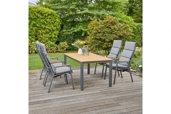 SIENA GARDEN Savona/Geneva Esstischgarnitur, graphit/grau, Alu/Teak/Texfabric, Tisch 160×90 cm, 4 Stapelsessel