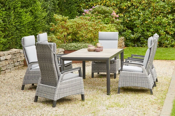 SIENA GARDEN Silva/Solea Dining Set, anthrazit/blau/grau, Alu/Gardino®-Geflecht/Keramik, ca. 182 x 100cm, inkl. 6 Diningsessel, stufenlos verstellbar