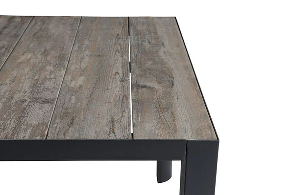 Wer das Besondere liebt ist mit diesem Esstisch bestens bedient. Der Tisch bietet mit seinen Maßen von ca. 183 x 100 x 74 cm Platz für 6-8 Personen – so steht dem gemütlichen Mittagessen mit der Familie nichts mehr im Wege. Das Gestell wurde aus pulverbeschichtetem Aluminium in matt anthrazit hergestellt, was den Tisch besonders haltbar macht. Die Tischplatte besteht aus hochwertigem Keramik in Holzoptik in der Farbe washed grey, während die dreieckig geformten Tischbeine für ein weiteres optisches Highlight sorgen. Die Unterschubhöhe beträgt ca. 68 cm – so kann man gemütlich mit vielen Arten von Sesseln an diesem Tisch Platz nehmen. Der Tisch hat ein Gewicht von ca. 54 kg, und ist somit perfekt gegen Windstöße geschützt. Die Fußkappen bestehen aus schwarzem Kunststoff und schützen den Boden vor unschönen Kratzern beim Verrücken des Möbelstücks.