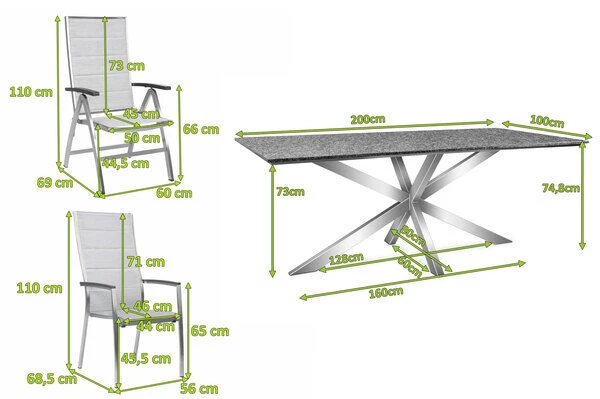 Ihre neuen Möbel bieten jeder Wetterlage die Stirn: die hochwertige Verarbeitung macht die Tischgruppe strapazierfähig, robust und äußerst wetterfest. Die soliden und formschönen Gestelle aus gebürstetem Edelstahl der Güteklasse 304 können sich auch bei schlechtem Wetter behaupten. Edelstahl ist besonders korrosionsbeständig und hält spielend sowohl Frost als auch Hitze aus. Natürlich können auch Feuchtigkeit und Regen dem rostfreien Material nichts anhaben. Um Edelstahl optimal vor Witterung zu schützen, braucht es nur sehr wenig Pflege. Die alltagstaugliche Tischplatte aus Granit ist gegenüber natürlicher Witterungs- und Wetterbedingungen unempfindlich und selbst Temperaturschwankungen bis zu mehreren hundert Grad machen dem Gestein nichts aus. Im trockenen Zustand ist Granit außerdem frostbeständig. Die schnelltrocknende Textilenbespannung der Sessel ist UV-beständig, reißfest und verliert nie ihre Form. Bei leichten Verschmutzungen reicht meist schon etwas Wasser und ein fusselfreier Lappen, um die Möbel wieder zum Strahlen zu bringen. Zusätzliche Fußkappen dürfen natürlich auch nicht fehlen, sie vermeiden unschöne Kratzer auf Ihrer Terrasse und schützen zudem das Gestell. Sie werden von der Qualität der Tischgruppe begeistert sein und sich viele Jahre daran erfreuen.