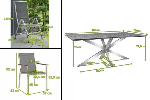 Ihr privater Essplatz unter freiem Himmel: diese elegante Esstischgarnitur ist sowohl für den Alltag als auch für die großen feierlichen Momente wie gemacht. Sie erhalten einen ausdrucksstarken Esstisch aus Edelstahl und Granit und neben 2 Multipositionssesseln mit verstellbaren Rückenlehnen gibt es auch 4 bequeme Stapelsessel, die für das richtige Ambiente sorgen. Lehnen Sie sich zurück und lassen Sie die Seele baumeln.