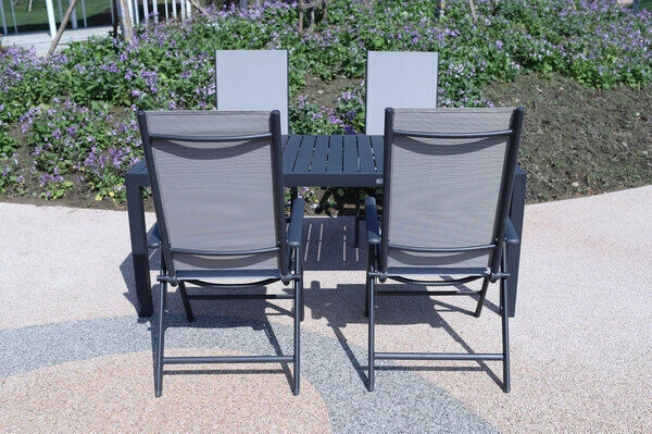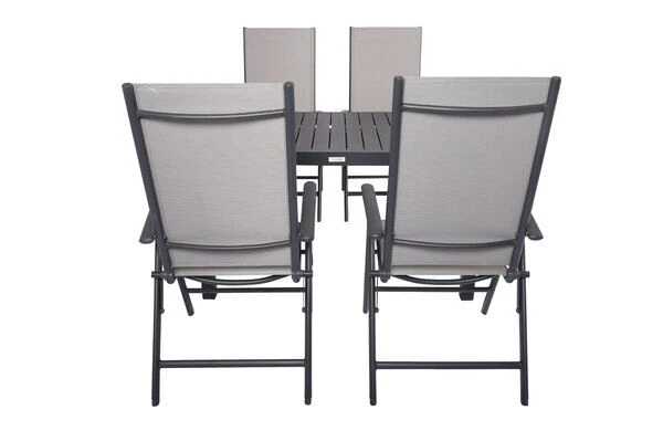 Die im Set enthaltenen Multipositionssessel sind nicht nur modern, sondern auch praktisch! Die Stühle mit Maßen von jeweils ca. 67 x 58 x 113 cm lassen sich bei Nichtgebrauch einfach zusammenklappen und platzsparend verstauen. Auch die Sessel haben ein Gestell aus pulverbeschichtetem Aluminium in der Farbe Anthrazit. Dazu ist das Leichtgewicht mit ca. 4,3 kg besonders stabil und beeindruckt mit einer maximalen Belastbarkeit von ca. 160 kg. Dabei kommt der Komfort nicht zu kurz! Die geteilte Sitz- und Rückenfläche ist mit dem modernen Material Textilene (70% Polyvinylchlorid, 30% Polyester) in der Farbe Grau bespannt. Das Kunststoffgewebe zeichnet sich vor allem durch seine hohe Belastbarkeit und seinen hohen Komfort aus. Zudem ist es frost- und hitzebeständig, was zusammen mit der hohen Lichtbeständigkeit für eine lange Attraktivität Ihrer Sitzmöbel sorgt. Auch nimmt Textilene kaum Feuchtigkeit auf, so dass die Sitzfläche nach einem Regenschauer schnell wieder trocken ist. Mit einer Sitzbreite von ca. 47 cm und einer Sitztiefe von ca. 41,5 cm wollen Sie aus diesem Stuhl gar nicht mehr aufstehen! Für das Plus an Komfort bietet Ihnen der Multipositionssessel eine 8-fach verstellbare Rückenlehne – lehnen Sie sich zurück und lassen Sie die Alltagssorgen hinter sich. Zusätzliche Fußkappen vermeiden unschöne Kratzer auf Ihrer Terrasse und bieten zugleich Schutz für Ihre Möbel.
