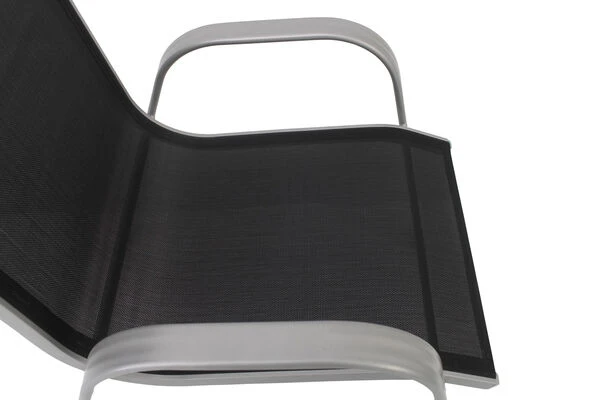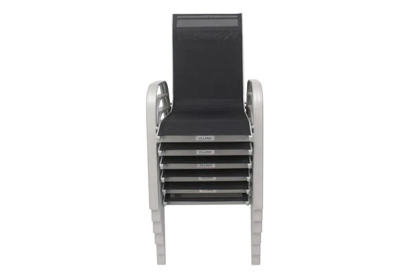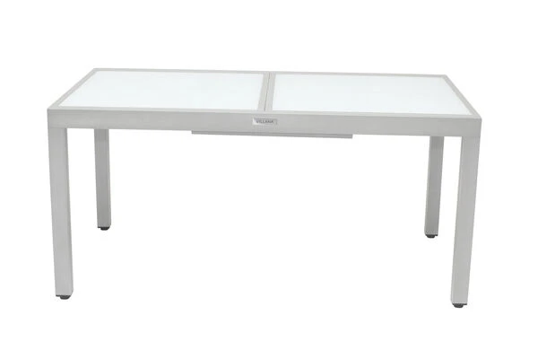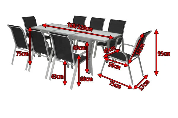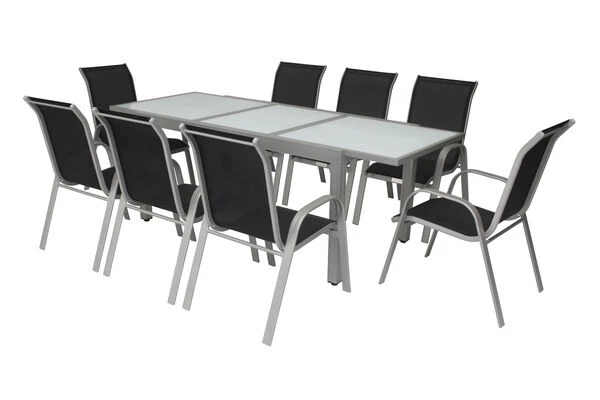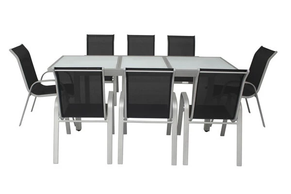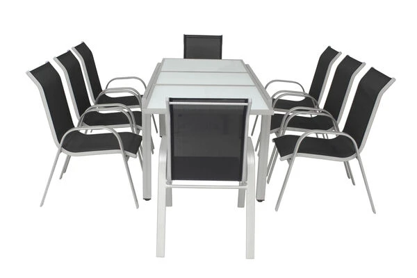 Diese Villana Esstischgruppe bietet Platz für acht Personen – perfekt, um mit Freunden, Familie oder Nachbarn gemütlich im Garten oder auf der Terrasse zu sitzen. Die Gruppe setzt sich aus einem ausziehbaren Gartentisch und acht Stapelstühlen zusammen, auf Wunsch können Sie diese Gruppe auch noch mit passenden Artikeln der Villana Serie erweitern. Der Tisch ist ca. 90 cm breit und ca. 75 cm hoch, im normalen Zustand hat er eine Länge von ca. 160 cm, so sind Sie sowohl für ein gemütliches Mittagessen mit der Familie als auch für die große Gartenparty bestens ausgerüstet. Das pulverbeschichtete Aluminiumgestell des Tisches kommt in einem attraktiven Silber daher, die ca. 5 mm dicke Tischplatte aus Sicherheitsglas ist weiß. Die Platte zum Erweitern des Tisches ist ebenfalls aus ca. 5 mm dickem Sicherheitsglas gefertigt und lässt sich durch einen Flügelmechanismus ausklappen. Man zieht einfach die beiden oberen Platten auseinander und klappt die darunterliegende Platte nach oben, und schon ist der Tisch auf ca. 220 cm erweitert. Der Stapelstuhl verfügt ebenfalls über ein silberfarben pulverbeschichtetes Aluminiumgestell, auf welches ein formstabiles Textil-Gewebe 2×1 (70% Polyvinylchlorid / 30% Polyester) in Schwarz aufgespannt wurde. Mit Maßen von ca. 75 x 57 x 95 cm und einem Gewicht von nur ca. 2,9 kg lässt sich der Stuhl ganz leicht hin und her stellen. Gleichzeitig bietet er die nötige Stabilität und dank der durchgehenden Sitz- und Rückenfläche einen angenehmen Sitzkomfort. Bei Nichtgebrauch lassen sich die Stühle beispielsweise in einem Gartenschuppen oder an einem anderen Ort gestapelt einlagern und nehmen so sehr wenig Platz ein. Mit einer Belastbarkeit von bis zu ca. 160 kg ist der praktische Sessel besonders robust und für erholsame Stunden in der Sonne einsatzbereit. Die Fußkappen der Möbel sind aus silbernem Kunststoff und schützen den Boden vor unschönen Kratzern beim Verrücken des Stuhles, die silbernen Schrauben aus galvanisiertem Stahl runden die Optik perfekt ab.