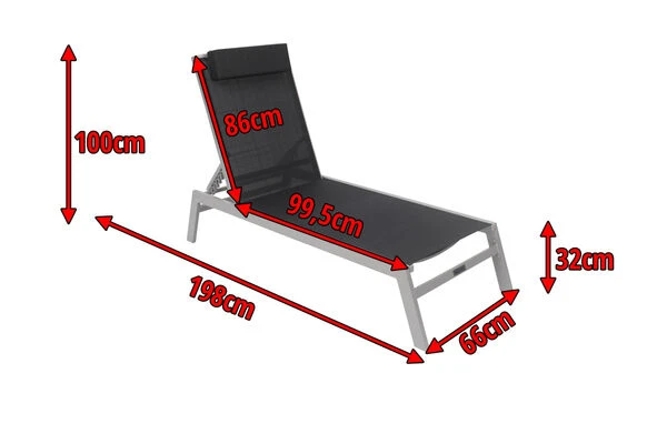 Diese schicke und zeitlose Gartenliege von Villana bereichert jeden Garten, Balkon, Spa-Bereich oder jede Terrasse. Sie ist mehrfach verstellbar, sodass man für sein Wohlgefühl die richtige Einstellung wählen kann. Die Liege verfügt über ein hochwertiges, silberfarben pulverbeschichtetes Aluminiumgestell, auf welches ein formstabiles Textil-Gewebe 2×1 (70% Polyvinylchlorid / 30% Polyester) in Schwarz aufgespannt wurde. Mit einer Belastbarkeit von bis zu ca. 160 kg ist diese Liege besonders robust und für erholsame Stunden in der Sonne einsatzbereit. Die Fußkappen sind aus silbernem Kunststoff und schützen den Boden vor unschönen Kratzern beim Verrücken des Stuhles, die silbernen Schrauben aus galvanisiertem Stahl runden die Optik perfekt ab. Mit einem Gewicht von nur ca. 8,1 kg und Maßen von ca. 198 x 66 x 32 cm fügt sich die Liege perfekt in Ihren Garten ein und lässt sich zusätzlich auch leicht hin und her stellen. Jetzt noch ein gutes Buch dazu und schon wird jede Minute in Ihrem Garten zur puren Entspannung.